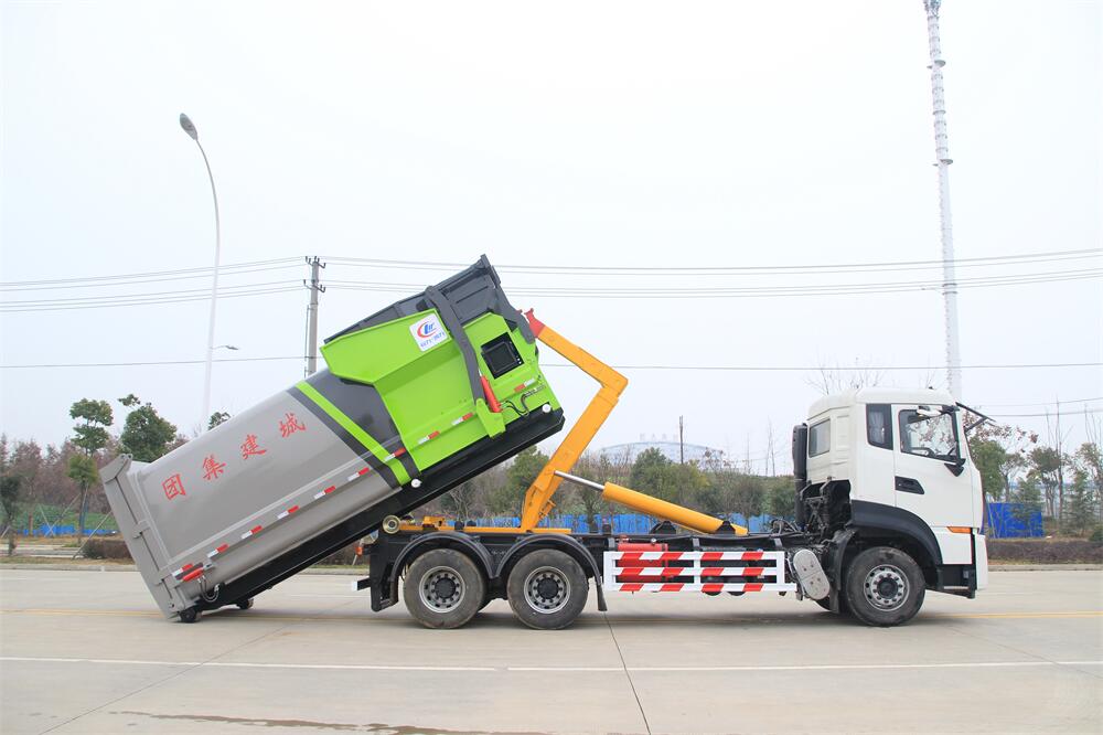 勾臂式垃圾車(chē)(車(chē)廂可卸式垃圾車(chē))介紹: 車(chē)廂可卸式垃圾車(chē)又叫拉臂式垃圾車(chē),是一種采用高新設(shè)計(jì)可伸縮的鉤臂,實(shí)現(xiàn)垃圾廂的二次吊裝,自吊上放下,可自行傾倒垃圾的環(huán)衛(wèi)設(shè)備。 拉臂式垃圾車(chē)結(jié)構(gòu)簡(jiǎn)單,操作穩(wěn)定方便,裝卸效率高,機(jī)械化程度高,節(jié)省人力。鉤臂垃圾車(chē)一車(chē)可帶多個(gè)垃圾廂,在裝卸的運(yùn)輸過(guò)程中可有效地避免二次污染。 拉臂垃圾車(chē)采用高新設(shè)計(jì)可擺動(dòng)的鉤臂,垃圾箱由框架、開(kāi)啟油缸、滑輪、后門(mén)和若干加強(qiáng)框架與鋼板焊接而成。調(diào)換貨廂快捷方便,貨廂上帶蓋(倒垃圾時(shí)可翻開(kāi)),鉤臂垃圾車(chē)?yán)鴰w可選用碳鋼、不銹鋼材質(zhì)、內(nèi)部采取環(huán)氧樹(shù)脂防腐處理,改裝部分與原車(chē)底盤(pán)為可分離式,維修方便且保持了原車(chē)的機(jī)動(dòng)性及行駛性能。