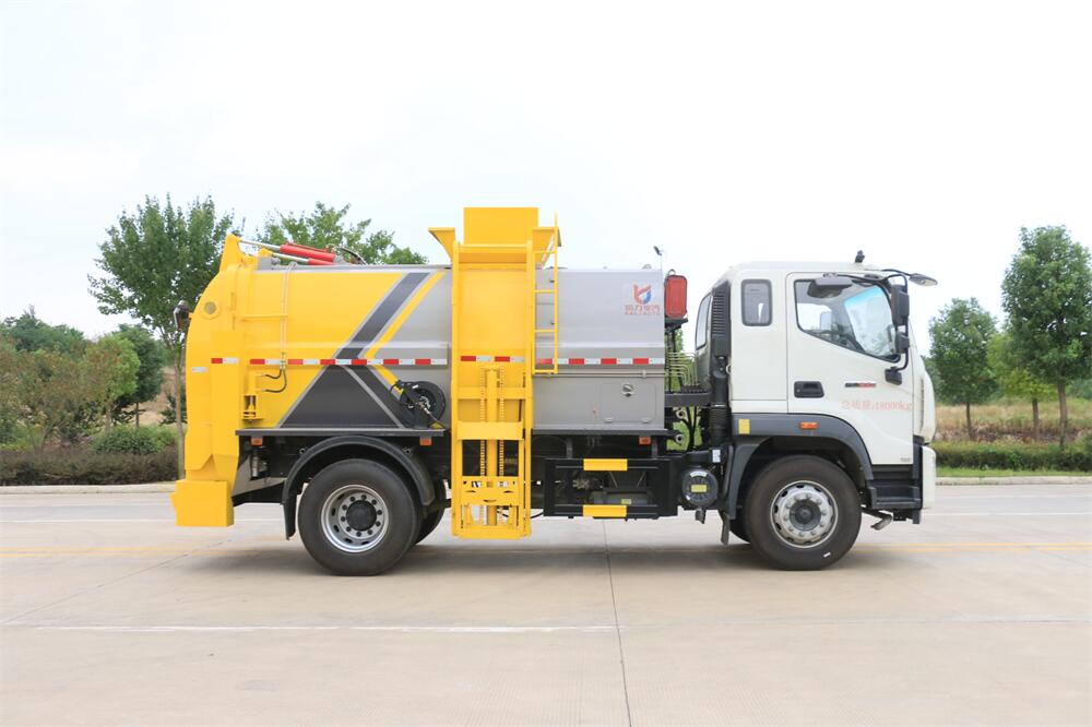 上裝配置:罐體容積10m3,配備120L/240L掛桶提升翻轉(zhuǎn)機(jī)構(gòu),液壓系統(tǒng),后蓋液壓鎖緊開啟,罐體可以舉升自卸,尾部帶自流閥;用于運(yùn)輸液態(tài)垃圾,其特點(diǎn)操作簡單,密封性好,無泄漏,無異味;可選裝固液分離功能,推板擠壓功能,常用于餐館的垃圾轉(zhuǎn)運(yùn)處理。