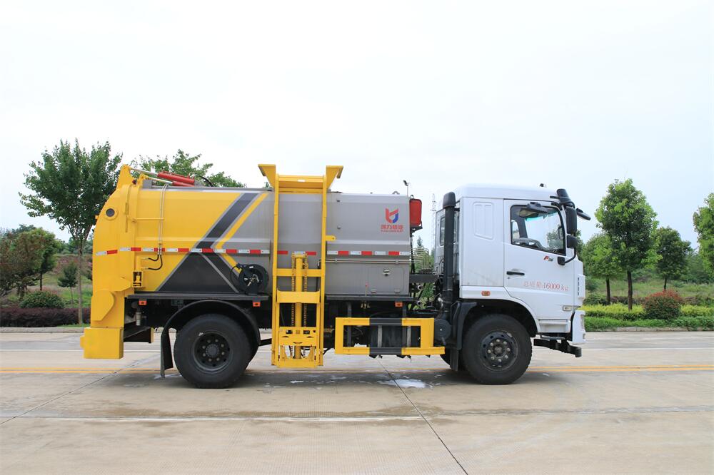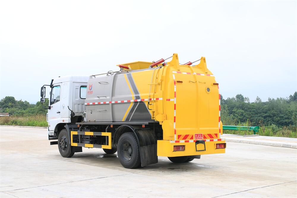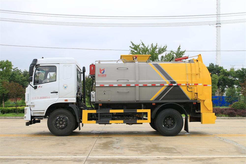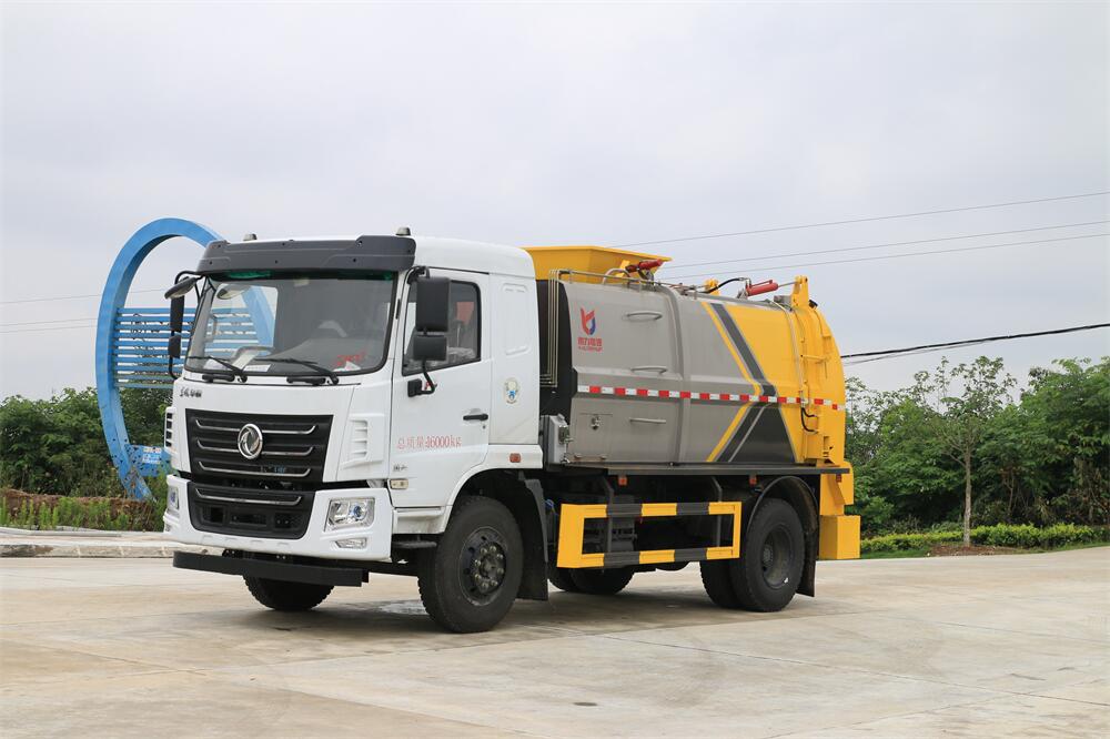 上裝配置:罐體容積10m3,配備120L/240L掛桶提升翻轉(zhuǎn)機(jī)構(gòu),液壓系統(tǒng),后蓋液壓鎖緊開啟,罐體可以舉升自卸,尾部帶自流閥;用于運(yùn)輸液態(tài)垃圾,其特點(diǎn)操作簡(jiǎn)單,密封性好,無(wú)泄漏,無(wú)異味;可選裝固液分離功能,推板擠壓功能,常用于餐館的垃圾轉(zhuǎn)運(yùn)處理。