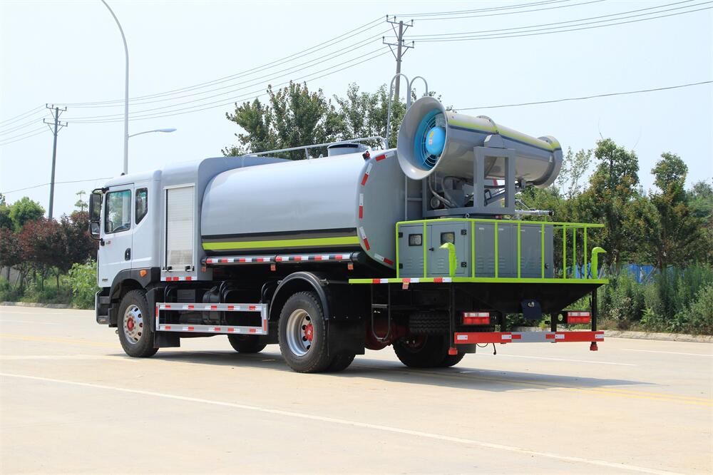 上裝配置:罐體容積為 12立方,選配風(fēng)送式霧炮機(jī)組射程30米、40米、50米、60米、80米、100米、120米霧炮,罐體鋼板為4mm碳鋼Q235材質(zhì),罐內(nèi)隔板具有防波作用,以減輕汽車行駛時罐體液體沖擊,罐體及整車外形尺寸按照公告。帶大功率專用灑水泵,泵可自吸自排,整車前沖、后灑、側(cè)噴、帶65消防接口,后平臺配CLW-50、CLW-60、CLW-80、CLW-100、CLW-120型風(fēng)送式霧炮機(jī)組;罐體前封頭配大功率柴油發(fā)電機(jī)組;前封頭帶水位計,后平臺主管路帶1寸澆花接口,后爬梯。帶兩根輸水管及陰陽端。罐體顏色:銀/灰/綠,罐體兩側(cè)噴“多功能抑塵車”字樣,貼反光標(biāo)示。