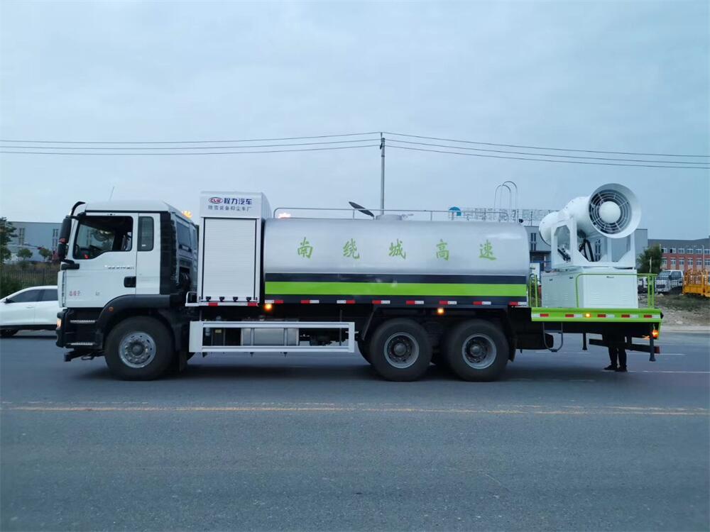 上裝配置:罐體容積為 16立方,選配風(fēng)送式霧炮機(jī)組射程30米、40米、50米、60米、80米、100米、120米霧炮,罐體鋼板為4mm碳鋼Q235材質(zhì),罐內(nèi)隔板具有防波作用,以減輕汽車(chē)行駛時(shí)罐體液體沖擊,罐體及整車(chē)外形尺寸按照公告。帶大功率專(zhuān)用灑水泵,泵可自吸自排,整車(chē)前沖、后灑、側(cè)噴、帶65消防接口,后平臺(tái)配CLW-50、CLW-60、CLW-80、CLW-100、CLW-120型風(fēng)送式霧炮機(jī)組;罐體前封頭配大功率柴油發(fā)電機(jī)組;前封頭帶水位計(jì),后平臺(tái)主管路帶1寸澆花接口,后爬梯。帶兩根輸水管及陰陽(yáng)端。罐體顏色:銀/灰/綠,罐體兩側(cè)噴“多功能抑塵車(chē)”字樣,貼反光標(biāo)示。