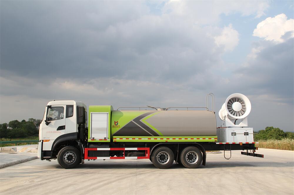 上裝配置:罐體容積為 16立方,選配風(fēng)送式霧炮機(jī)組射程30米、40米、50米、60米、80米、100米、120米霧炮,罐體鋼板為4mm碳鋼Q235材質(zhì),罐內(nèi)隔板具有防波作用,以減輕汽車行駛時(shí)罐體液體沖擊,罐體及整車外形尺寸按照公告。帶大功率專用灑水泵,泵可自吸自排,整車前沖、后灑、側(cè)噴、帶65消防接口,后平臺(tái)配CLW-50、CLW-60、CLW-80、CLW-100、CLW-120型風(fēng)送式霧炮機(jī)組;罐體前封頭配大功率柴油發(fā)電機(jī)組;前封頭帶水位計(jì),后平臺(tái)主管路帶1寸澆花接口,后爬梯。帶兩根輸水管及陰陽端。罐體顏色:銀/灰/綠,罐體兩側(cè)噴“多功能抑塵車”字樣,貼反光標(biāo)示。