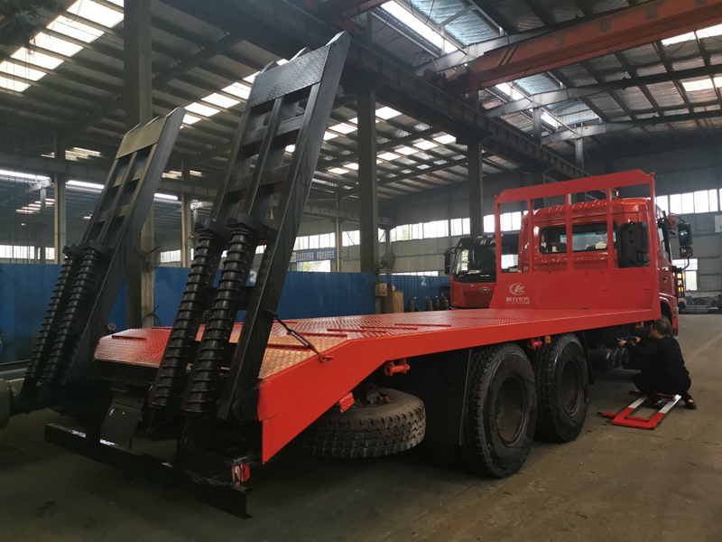 上裝采用八毫米花紋鋼板,120套100方管做橫梁,加強(qiáng)雙簧爬梯,可拉25噸-30噸以下挖機(jī)。