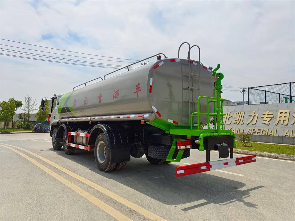 灑水車前裝有鴨形噴嘴或圓頭沖嘴,后面裝有圓柱開灑水噴嘴或蓮蓬頭噴嘴,后部有一工作平臺(tái),裝配有水炮。后部還可裝8個(gè)噴嘴(選裝)。